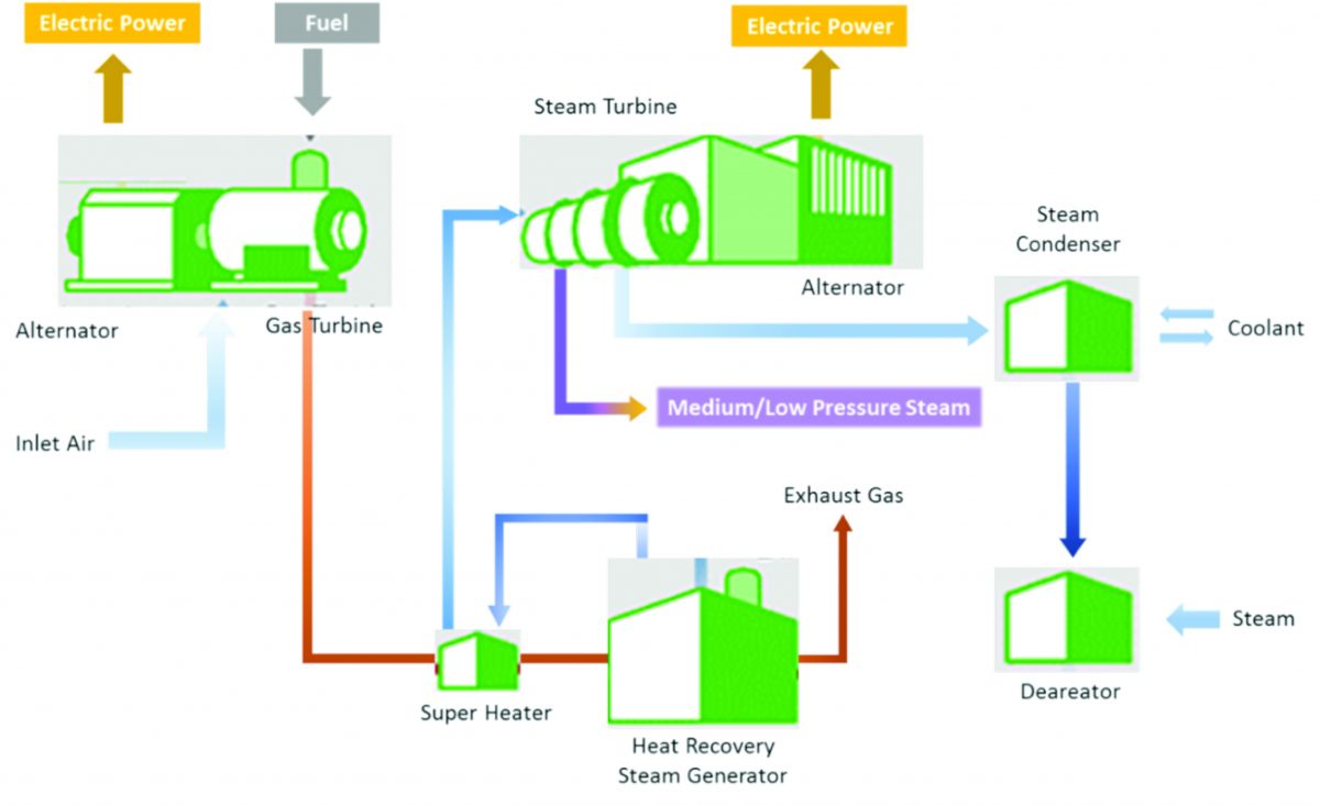 With this technology, the energy for electricity generation is obtained from the combustion of natural gas. Hot combustion gases formed by the combustion of natural gas drive a gas turbine, which, in turn, rotates an alternator to produce electricity. After driving the GTs, the exhaust gases are still hot enough to produce steam in a HRSG. The steam generated in the heat recovery boiler drives a steam turbine, which rotates another alternator to produce additional electricity. The CCGT technology is well proven and more efficient than conventional power plant technology. The process is explained in more detail below: